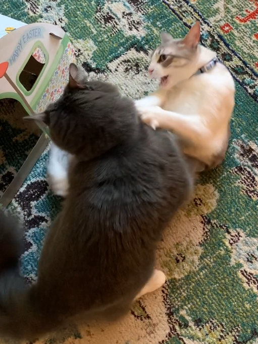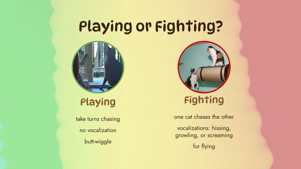 Cats play rough, so it can be hard to tell if they are playing or fighting. Like any relationship, it’s not black & white. It’s definitely a spectrum, and we need to look at the big picture – considering behavior patterns in context and over time – to really be able to tell.