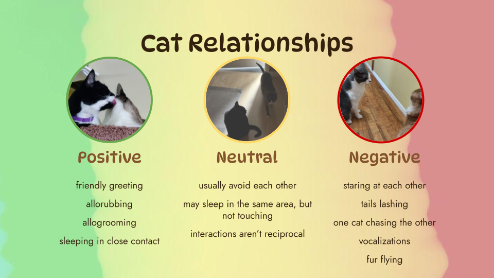 A strong negative relationship is often obvious, but a slightly negative or neutral relationship is harder to identify. If the cats sleep near each other but aren’t actually physically touching, they don’t often nose-touch, head-butt (bunt), or rub against each other, and their interactions are rarely mutual, they may have a neutral relationship. That’s fine if they mostly avoid each other. However, if one cat often corners another and there is hissing and growling, then there is likely tension in their relationship, which can be harmful for their well-being in the long run (Gajdoš-Kmecová et. al, 2023).